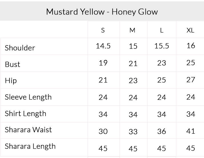 Color: Mustard Yellow Fabric: Shirt: Rameen Silk, Sharara: Chiffon, Dupatta: Chiffon Work Details: Embroidered