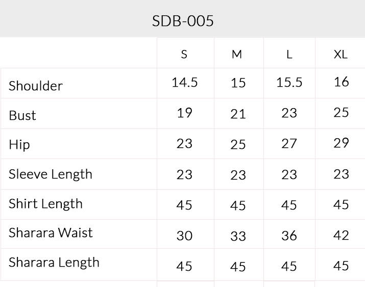 An ice blue fully embroidered jacket with intricate adda work, layered over an embroidered corset. Paired with a panelled sharara featuring gota detailing and bordered edging, the look is finished with a scalloped dupatta for a refined, contemporary statement.